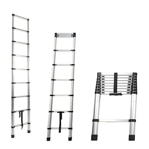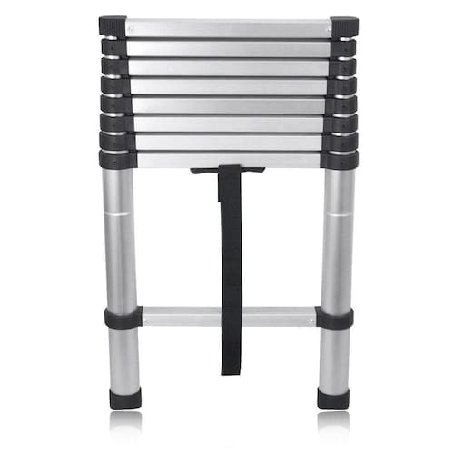 Em alumínio com pés antiderrapantes. Possui travas de segurança para elevação de cada degrau. Dimensões: - 2,6m (8degraus) de extensão máxima na posição totalmente esticada, - 73cm (8 degraus) de altura na posição fechada para armazenamento. Suporta o peso máximo de 150kg. Embalagem: caixa de papelão com 1 peça.