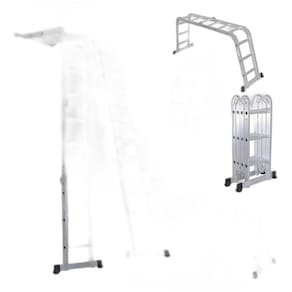 A Escada Multiuso é fabricada em alumínio de alta qualidade, garantindo uma estrutura compacta e fácil de transportar. Sua super resistência de até 150 kg proporciona segurança em cada degrau. Com pés de borracha que não deslizam, dobradiças de aço e travas de segurança, você pode confiar na estabilidade deste produto.