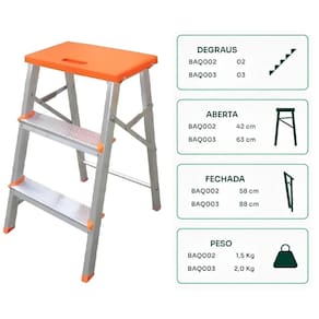 Características: - Estrutura da banqueta 100% em Alumínio - Acessórios e patamar em polipropileno com articulação lateral - Barra inferior traseira de reforço da estrutura - Sapatas e degraus antiderrapantes - Produto indicato até 100 Kg