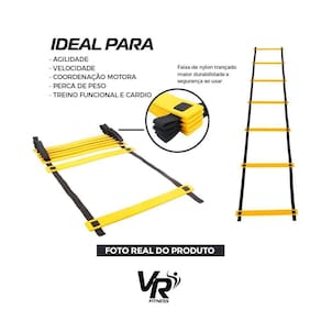 - 6 degraus reforçados e ajustáveis. A distância entre os degraus é ajustável, adequando-se aos mais variados exercícios e treinamentos esportivos; - Tamanho total da escada é de 2,40 metros de comprimento x 0,50cm largura. - Dobrável, facilita na montagem/desmontagem e transporte. - Degraus especialmente fabricados em EVA 5mm espessura super resistentes para maior estabilidade.