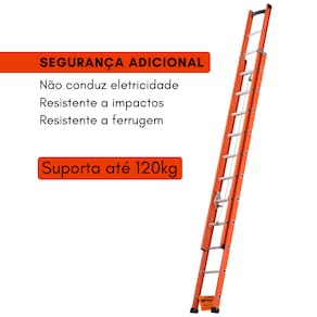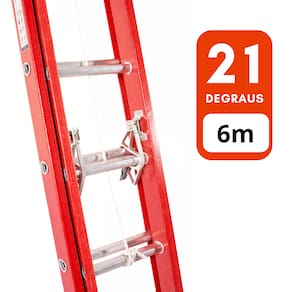Contém: 21 degraus Peso: 16Kg Capacidade de carga: 120 kg Escada fechada: 3,60 m de altura Escada estendida: 6,00 m de altura Material: Fibra de vidro.