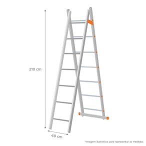 Dimensões Altura máxima da escada aberta: 1,80 metros Largura do degrau: 7,5 cm Tamanho total do produto fechado (AxL): 210 x 40 x 25 cm Peso: 11 Kg
