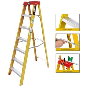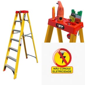 Não condutora de eletricidade Escada de fibra tesoura prática 6 degraus efp9901 Escada de fibra - tesoura prática - 6 degraus - btf Cada vez mais conhecida no mercado nacional como a escada do eletricista a nossa tesoura de fibra prática vem colhendo frutos por seu excelente projeto. Não condutora de eletricidade. Confortável e segura com seus degraus largos e antiderrapantes, sapatas de borracha e sistema de fechamento antibeliscão. ela ainda tem um topo multiuso capaz de apoiar todas as ferramentas necessárias para os serviços elétricos gerais. Além disso, possui de 12 meses, suporta até 120kg e está disponível de 3 a 8 degraus. Esta é a tesoura de duplo acesso robusta. Indicada para uso comercial e industrial pesado. Ela é mais forte e estável que sua irmã tesoura prática, devido aos seus dois montantes largos e sapatas enormes. Suporta até 150kg e em seu maior tamanho 17 degraus seu alcance chega a 4,89m. Então já sabe: para trabalhos elétricos de pequeno, médio ou grande porte, use as escadas de fibra tesoura botafogo Marca: Não Informado