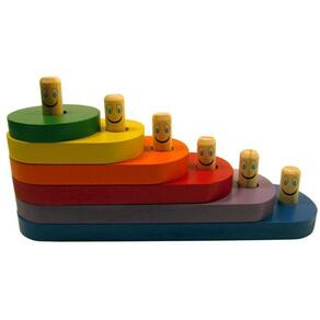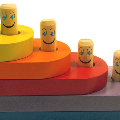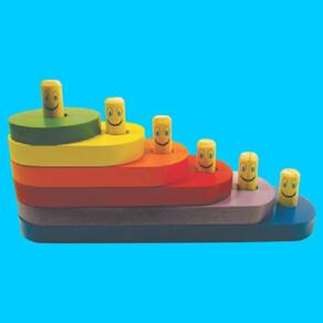 Trabalha a sobreposição das peças, dimensões, coordenação simples, raciocínio combinatório, percepção tátil e habilidades funcionais. 06 peças coloridas em MDF, a maior medindo 240mm x 65mm x 15mm, com carinhas estampadas nos pinos. Idade: a partir de 18 meses.