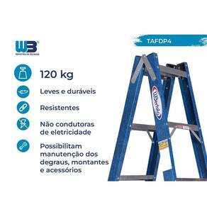 -Garantia: 12 meses Altura Máxima da Escada: 120 Ambiente Principal: Área de Serviço Antiferrugem: Sim Certificado: Não Cor da Estrutura: Azul Cor dos Degraus: Prata Cor dos Pés: Preto Cor Predominante: Azul Degraus Antiderrapantes: Sim Degraus Divididos Em: Possui Apenas 01 Sequência de Degraus Dobrável: Não Função: Profissional Itens Inclusos: Nenhum Largura da Escada: 41 Largura do Degrau: 37 Material da Estrutura: Fibra de Vidro Material dos Pés: Borracha Número de Posições: 01 Origem do Produto: Nacional Pés Antiderrapantes: Sim Peso: 5 Possui Limitador de Abertura: Sim Profundidade do Degrau: 6.1 Quantidade Total de Degraus: 04 Recomendações de Uso, Manutenção e Limpeza: Orientações Gerais para Uso, Transporte e Conservação das Escadas Orientação para Uso: 1 – Utilizar as escadas sobre piso firme e nivelo, seja cuidadoso em pisos escorregadios; 2 – Não utilizar nenhum objeto para aumentar a altura da escada; 3 – Nunca use a escada como andaime; 4 – Use cinto de segurança para subir ou descer da escada enquanto tiver trabalhando; 5 – Não exceder 60 cm do topo da escada; 6 – Utilize a escada no ângulo apropriado, 75º; 7 – Verifique se as catracas estão devidamente travadas antes de subir; 8 – Observar o limite de abertura – Faça uma inspeção visual antes do uso; 9 – Para escada extensiva o deslizamento deve ser leve e suave tanto na subida, quanto na descida; 10 – Não é permito reparo nos montantes da escada; 11 – Não exceder a carga máxima total especificada para a escada; 12 – Escadas tesouras: Não pisar na plataforma sem alça de apoio e certificar de que a escada esteja totalmente aberta antes do uso; 13 – Os EPI’s a serem utilizados, deverão seguir as Normas de Segurança da empresa; 14 – Não desça ou suba as escadas de costas para ela; ORIENTAÇÃO PARA TRANSPORTE: 1 – Transporte sua escada sobre apoio de borracha ou plástico; 2 – Amarre firmemente a escada para evitar atritos e impactos; 3 – Escadas com até 4 metros poderão ser transportadas por uma pessoa, devendo ser mantida na parte dianteira. Escadas com mais de 4 metros deverão ser transportadas por duas pessoas; 4 – Tome cuidado com choques em linhas energizadas ao transportar escadas. ORIENTAÇÃO PARA MANUTENÇÃO: 1 – Reparos e manutenção nos montantes só poderão ocorrer sob orientação e após um parecer do fabricante; 2 - A escada deverá ser reparada se apresentarem quaisquer defeitos indicados a seguir: Cinta de apoio danificada ou solta; Sistema de travamento, roldana, guias, sapatas com trincas ou danificadas, mola solta ou lingüeta quebrada; Tirantes e parafusos folgados; Suporta Até (kg): 120 Tipo de Certificado: ISO 9001 Ean: 7898043627376