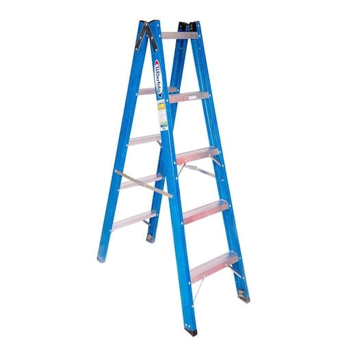 As escadas tesoura duplo acesso Premium são em formato A, possuem limitadores antibeliscão, os degraus são em alumínio e antiderrapante.