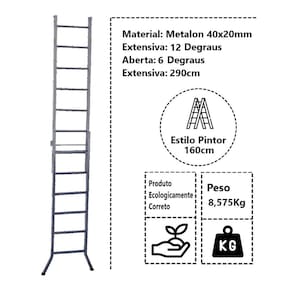 Escada Extensiva 3 em 1 Metalon 40x20mm 6 e 12 Degraus 160cm, uma escada é uma construção formada por uma série de degraus, destinada a ligar locais com diferenças de nível.