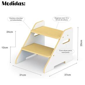 Escada infantil montessoriana com 2 degraus, cantos arredondados e pegador anatômico. Incentiva a independência e autonomia da criança. Feita de madeira de reflorestamento com pintura atóxica. Certificada pelo Inmetro. Suporta até 35 kg.Tipo