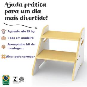 Características Gerais do produto Escada infantil metrosontessoriana cometros 2 degraus, cantos arredondados e pegador anatômetrosico. Incentiva a autonometrosia e independência da criança. Feita de metrosadeira de reflorestametrosento cometros pintura atóxica. Certificada pelo Inmetrosetro. Fácil de metrosontar.