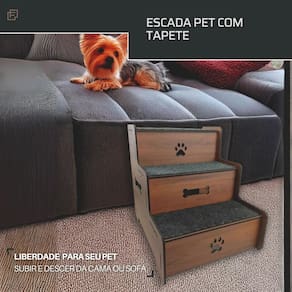 Escada para Cachorro 3 degraus escadinha para cachorro Pet Escada desenvolvida e pensada para seu PET ter mais conforto e acessibilidade em locais de dificil acesso. Produzida com material de alta qualidade e resistencia, suportando tambem animais de grande porte. Diferenciais do Nosso Produto Degraus em mdf 6mm, suportando até 8kg Escada montada com encaixes e parafusos Tapete antiderrapante Evita lesões e acidentes com seus pets ESPECIFICAÇÕES DO PRODUTO - Altura: 46 cm - Largura: 40 cm - Profundidade: 50 cm - Altura dos Degraus: 15 cm - Largura dos Degraus: 17 cm - Número de Degraus: 03 - Estrutura Degraus: MDF 6 mm - Revestimento: Melamina - Acompanha kit para de instalação. INSTALAÇÃO A instalação é bem simples, basta acompanhar o passo a passo do manual LIMPEZA / MANUTENÇÃO Para limpeza, utilize apenas um pano umedecido com água sem produtos químicos para garantir a durabilidade. TOTAL: Todos nossos produtos contam com contra defeitos de fabricação. Marca: Não Informado Ean: 7906585675219