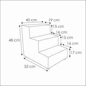 Escada para Cachorro Estofada 3 Degraus - KF Móveis Cor: Suede Preto Escada Pet Escadinha 3 Degraus para Cachorro - KF Móveis. Para que serve a escada pet Resp: Auxiliar nossos amiguinhos ao subir ou descer de lugares como sofás, poltronas, camas,etc. Evitando o impacto de suas articulações contribuindo para o bem estar do seu Pet. O produto é enviado montado Resp: Sim. Qual é o peso suportado Resp: Para animais com peso até 30 kilos. Qual é as medidas da escada Resp: Altura: 48 cm.Largura: 40 cm.Profundidade: 52 cm. Altura dos Degraus: 0,16 cmProfundidade dos Degraus: 0,16 cm Qual o material utilizado em sua estrutura Resp:Espuma D23 nos degraus e laterais.Material da Estrutura: Madeira de Reflorestamento.Revestimento: Com tecido linha A.Possui Sapatas : Sim. Informações adicionais:Volumes: 1 Volume. Garantia do Fabricante: 90 dias contra defeitos de fabricação.Recomendação de Limpeza: Utilize pano levemente úmido. Pode ocorrer alguma diferença de tonalidade entre a imagem e o produto real, por conta do tratamento de imagens e a calibração de cores do seu monitor ou celulares. As imagens são meramente ilustrativas, não acompanham objetos de decoração e eletrônicos. Tag;EscadinhaEscada PetPetCachorroDegrausMdfPara GatoRampaAndaresE3ComAlturaCm