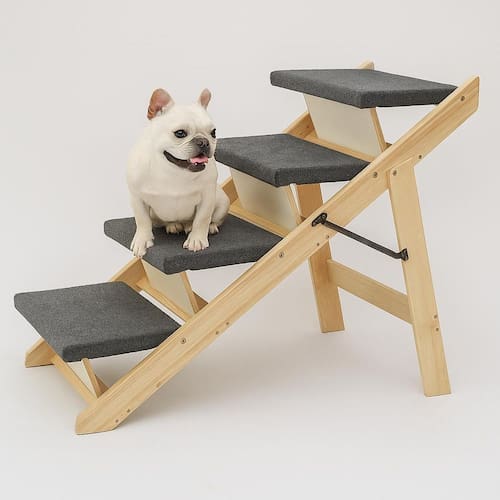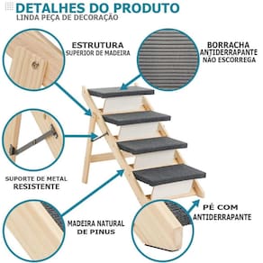 4 Degraus: A altura ideal para cães e gatos de grande, médio e pequeno porte, facilitando o acesso a sofás, poltronas e outros locais elevados. Madeira e Aço: Combinação de materiais que garante resistência, durabilidade e um visual elegante que combina com a decoração da sua casa. Superfície Antiderrapante: Revestimento especial que evita que seu pet escorregue, proporcionando mais segurança durante o uso. Fácil de Montar e Desmontar: Sistema de encaixe prático que permite a montagem e desmontagem da rampa sem ferramentas, facilitando o transporte e armazenamento. Leve e Portátil: Design leve e compacto que facilita o transporte da rampa para qualquer lugar que você vá com seu pet. Versátil: Pode ser utilizada em diversos ambientes internos e externos, como casa, apartamento, carro, viagens e muito mais.