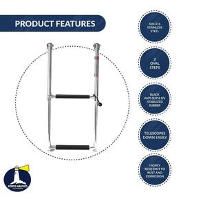 Escada telescópica retratíl em aço inox Esta escada telescópica para barco sobre plataforma marítima, 2 etapas para uso no convés e montagem na plataforma. Ideal para um acesso seguro de e para a água. Fabricado em aço inox aisi316 com alta resistência à ferrugem e corrosão, mesmo quando exposto à água do mar. Os degraus são cobertos com material de borracha preta anti-derrapante e estabilizada aos raios uv. Degraus ovais, proporcionam um ambiente mais suave e confortável do que degraus arredondados tradicionais.