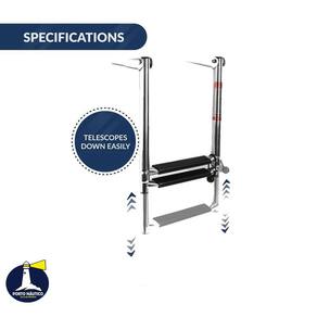 Escada telescópica retratíl em aço inox Esta escada telescópica para barco sobre plataforma marítima, 2 etapas para uso no convés e montagem na plataforma. Ideal para um acesso seguro de e para a água. Fabricado em aço inox aisi316 com alta resistência à ferrugem e corrosão, mesmo quando exposto à água do mar. Os degraus são cobertos com material de borracha preta anti-derrapante e estabilizada aos raios uv. Degraus ovais, proporcionam um ambiente mais suave e confortável do que degraus arredondados tradicionais.