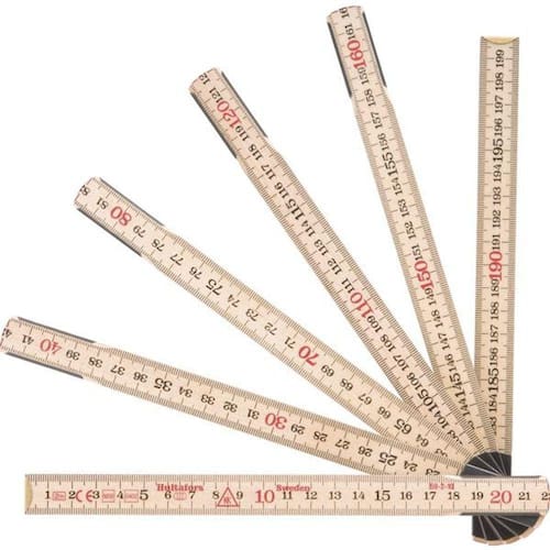 Graduação da escala : mm Comprimento da escala métrica: 2 m Tipo de marcação da escala: Pintada Espessura da escala : 2,4 mm Material da escala: Madeira Largura da escala: 17,3 mm Classe de precisão : Classe III Número de dobras da escala métrica: 10