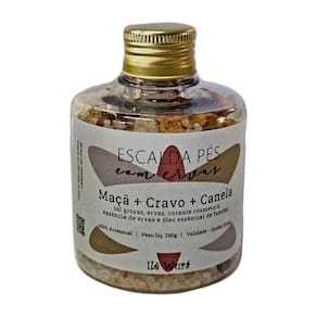 Escalda pés premium maçã, cravo, canela, óleo essencial 250g Escalda pés premium maçã, cravo, canela com óleo essencial pote 250g Natural, artesanal e fitoterápico Composição - sal grosso, corante cosmético, essência, ervas, óleo essencial Cada pote contém 250g de sais com ervas e serve até para 5 imersões. Embalagem - pote plástico com tampa dourada em rosca Escalda pés relaxante feito artesanalmente com ervas naturais, ideal para aqueles dias cansativos e estressantes. Benefícios: alivia o , melhora a circulação, reduz inchaços e revigora as energias Maçã - auxilia o , melhora a circulação e reduz inchaço Cravo - estimula a circulação e combate varizes Canela - alivia o e a tensão - melhora a circulação Óleo essencial de funcho - antiséptico e . Por se tratar de um produto artesanal, Pode ocorrer variação de aroma Modo de usar: em uma bacia grande, coloque 1,5 litro de água morna ou quente ou o suficiente para cobrir os pés e 1 colher bem cheia do escalda pés. Deixe seus pés relaxarem por 10 a 20 minutos. Marca: Não Informado
