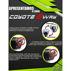 Trata-se de um exclusivo e inédito sistema de alternância de ronco esportivo e silencioso no mesmo escapamento. O sistema Coyote 2 Way é único no mundo pela sua facilidade, em menos de 5 segundos você muda o ronco para esportivo ou silencioso, pela sua praticidade, você não precisará de ferramentas específicas para essa mudança, e pela sua segurança, você não tem contato com a peça, evitando queimaduras caso a peça esteja quente.A Coyote melhorou o que já era ótimo. A Linha de escapes 2 Way, o único escapamento do mundo com troca rápida de ronco agora com a troca de ronco no guidão. Isso mesmo, você instala o escape em sua moto e através de cabos e um seletor de ronco fixado no guidão, você poderá trocar rapidamente de ronco esportivo ao silencioso.São 4 níveis de ronco: Esportivo, Semi-Esportivo, Semi-Silencioso e Silencioso.