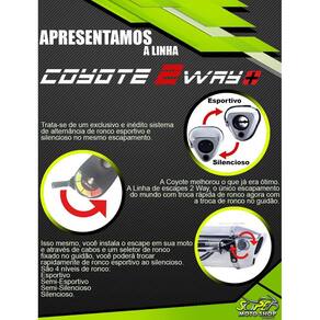A linha de escapamentos COYOTE 2 Way foi desenvolvida em formado tri-oval e possuí o sistema exclusivo de alternância de ronco entre silencioso e esportivo.Desenvolvido pela equipe de engenharia mecânica e designers, a linha garante melhor desempenho e a tranquilidade de alternar o ronco entre silencioso e esportivo. Disponível em três cores: polido, preto/cromado e preto/black. O modelo é fábricado para diversos modelos de moto.Ponteiras produzidas em alumínio e curva em aço carbono, garantem a qualidade padrão Coyote ao produto.Dentro da embalagem acompanham a curva ou coletor em aço carbono, ponteira, cinta/abraçadeira e todos os parafusos, tuchos e itens necessários para realizar a devida instalação na qual recomendamos que seja feita por um profissional da área.