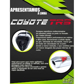 Escapes esportivos confeccionados em alumínio polido ou preto no formato de 3 lados (trioval).Proporciona melhor performance em médios e altos rpms, favorecendo a subida rápida de giro, retomada de velocidade, menor giro do motor em velocidades de cruzeiro, devido a menor restrição, o que contribui para um menor desgaste das peças internas do motor. Ideal para quem quer maior agilidade e performance na cidade ou estrada, com uma pilotagem mais esportiva. Proporciona um ronco encorpado e grosso, dando a impressão de ser uma moto de maior cilindrada.
