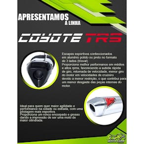Escapes esportivos confeccionados em alumínio polido ou preto no formato de 3 lados (trioval).Proporciona melhor performance em médios e altos rpm's, favorecendo a subida rápida de giro, retomada de velocidade, menor giro do motor em velocidades de cruzeiro, devido a menor restrição, o que contribui para um menor desgaste das peças internas do motor. Ideal para quem quer maior agilidade e performance na cidade ou estrada, com uma pilotagem mais esportiva.Proporciona um ronco encorpado e grosso, dando a impressão de ser uma moto de maior cilindrada.