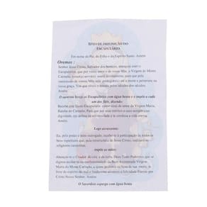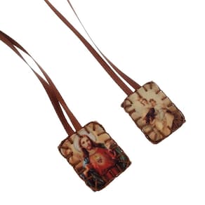 Escapulário de feltro infantil com imagem de Nossa Senhora do Carmo e Sagrado Coração de Jesus e fita de cetim na cor marrom. A peça acompanha um folheto de oração.