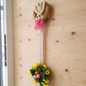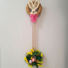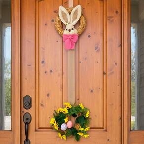 Decore seu ambiente com charme e espírito pascal usando este pendente escapulário em formato de guirlanda com cabeça de coelho, ideal para deixar sua casa ainda mais acolhedora na Páscoa. Com design delicado e tamanho imponente, é perfeito para portas, paredes, vitrines e ambientes internos