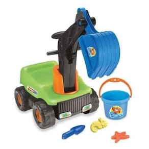Em plástico resistente colorido (amarelo/verde), com braço e pá móveis em 360° controlados por manivelas, suporta até 30 kg, inclui capacete de segurança e acessórios como baldinho, pá e moldes para brincadeiras completas.