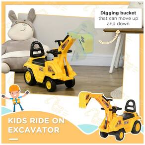 Informações sobre a Escavadeira Infantil: Dimensões totais: 86 comprimento x 27 largura x 55 altura em centímetros Dimensões do assento: 22 comprimento x 16 largura x 22 altura centímetros Capacidade de peso: 66 libras 29,94 kg. Certificações: ASTM F963 17, HR4040, SOR. Adequado para crianças a partir de 3 anos.