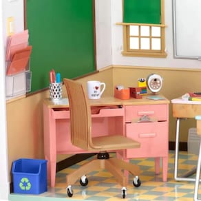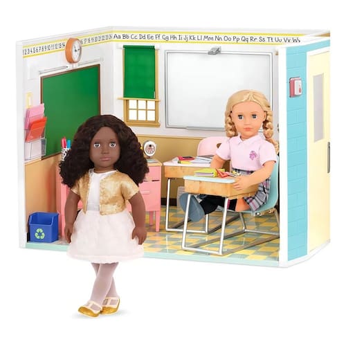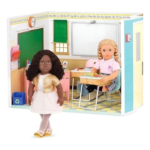 Uma pequena escola para grandes ideias! A Escola Our Generation está pronta para mostrar a você o por que “escola” rima com “legal”! Estamos selecionando os melhores livros e afiando nossos lápis neste playset de sala de aula totalmente abastecido para bonecas de 46cm e, para ser honesta, estamos rindo bastante ao longo do caminho. O que vamos aprender hoje? Seja o que for, com certeza será incrível!Brincar de escolinha nunca foi tão divertido, e a Escola Our Generation tem tudo o que você precisa para construir seu próprio mundo de aprendizado!“Brr-ring, brr-ring!” Toque a campainha para avisar os alunos quando é hora da aula - a campainha realmente funciona! Caminhe pelas clássicas paredes de tijolos vermelhos para encontrar a sala de aula. Sente-se em uma das duas mesas dos alunos. Abra a tampa para obter cadernos, lápis e canetas. Use a folha de presença para verificar quem está presente ou ausente. Para os alunos que se esforçam mais, o professor pode dar um certificado de aproveitamento ou escrever seus nomes na folha de bom comportamento. Use o giz de verdade para escrever as lições no quadro-negro e um apagador para escrever no quadro branco. Acenda as luzes da sala de aula para ter uma visão melhor.As Bonecas OG adoram estudar tantos assuntos diferentes que é difícil escolher apenas um favorito! Você tem uma aula favorita? (Ou talvez duas? Ou três?) Escola Our Generation vem com todos os tipos de material escolar, como apagador, adesivos, canetas, tesouras, post-its e muito mais! Use os armários do corredor para guardar todas as suas coisas quando a escola terminar. Com áreas de lazer dentro e fora da sala de aula, o tamanho desta escola será do tamanho que você imaginar!