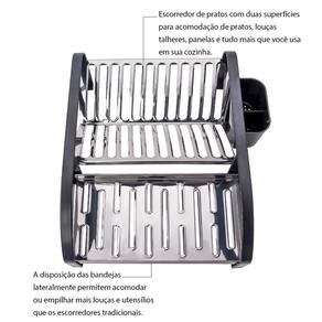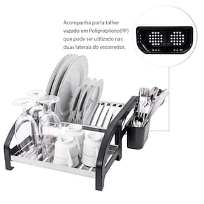Escorredor de pratos com duas superfícies para acomodação de pratos, louças talheres, panelas e tudo mais que você usa em sua cozinha. Suas bandejas de acomodação ficam unidas lateralmente em bases de pp polipropileno na cor preta que deixam seu escorredor firme e com um design moderno. Acompanha porta talher em pp polipropileno que pode ser instalado nas duas laterais do escorredor. A disposição das bandejas lateralmente permitem acomodar ou empilhar mais louças e utensílios que os escorredores tradicionais. Bonito, prático e fácil de fácil limpeza. Altura: 15cm; Largura: 44,8cm; Comprimento: 31,7cm; Peso aprox. 0,980kg. Marca: Não Informado Ean: 7898681710492