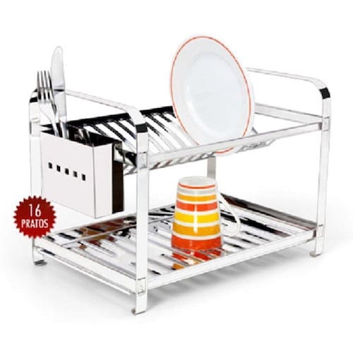 Escorredor Inox 16 Pratos Montado com Porta Talheres Mak Inox