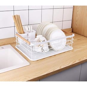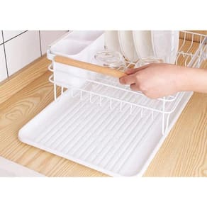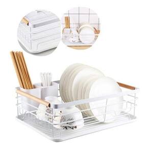 Escorredor De Louças De Pia Com Bandeja Viena Porta Prato 43x32x14cm O visual é moderno, aumenta sua organização, além de ser feito em metal e com alças de madeira. Ideal para facilitar sua organização na bancada da cozinha. Auto sustentação, com auxílio de pés para pôr na bancada da pia. Contém suporte de talheres de plástico removível com 2 compartimentos para pauzinhos, garfos e colheres, o suporte para louças acomoda até 10 pratos e pratos grandes, e tem espaço adicional para canecas, tigelas... Bandeja coletora contém todo o escorredor de louça e captura todo o excesso de água, contribuindo para manter a cozinha limpa e arrumada.