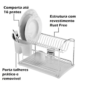 O kit perfeito para manter a pia seca e limpa: Escorredor de Louças com Bandeja coletora de água. O escorredor tem capacidade para 16 pratos e muito espaço para armazenamento das louças no andar inferior. O porta talheres é plástico e removível.