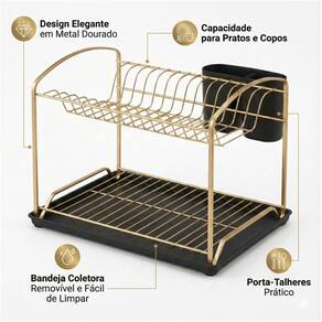O Escorredor de Louças conta com uma estrutura em aço piatina (aço em formato achatado) que proporciona design diferenciado e traz beleza para cozinha. Possui 2 andares o que garante mais espaço para armazenar as louças, além de possuir porta talheres removível, com a bandeja que evita respingos indesejados auxilia na limpeza.