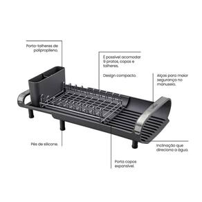 Escorredor De Louça Míni Tramontina Plurale Com Secador E Porta Talheres Grafite Para aqueles dias de rotina corrida que você não tem muito tempo para as tarefas de casa, conte com o escorredor de louça Tramontina em aço Inox com secador e porta talheres compacto grafite. Desenvolvido especialmente para cozinhas pequenas e que possuam bancadas com pouco espaço, ele conta com produção em aço inox e com um prático porta talheres em polipropileno com perfeito encaixe em sua superfície. Compacto mais sem deixar de acomodar as louças que você precisa, ele comporta 9 pratos, talheres e copos, sendo o porta copos expansível. Possui alças que proporcionam maior no manuseio e inclinação que direciona a água para a bandeja coletora, fazendo com que ela caia direto para a pia. Um item prático e indispensável para quem está sempre na correria! Recomendações de Uso: Para que seu produto de aço inox Tramontina fique sempre bonito e com brilho, recomendamos que seja lavado somente com detergente e da lavagem, sempre que possível, enxágue o produto com água quente e seque-o imediatamente, para que se mantenha com o brilho , pois o cloro e as substâncias contidas na água podem deixar manchas. Informações Adicionais: