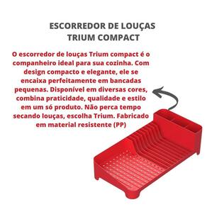 O escorredor de louças Trium compact é o companheiro ideal para sua cozinha. Com design compacto e elegante, ele se encaixa perfeitamente em bancadas pequenas. Disponível em diversas cores, combina praticidade, qualidade e estilo em um só produto. Não perca tempo secando louças, escolha Trium. Fabricado em material resistente PP Características do Produto: