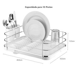 Escorredor De Louças 12 Pratos e Talheres Branco - Future A loja Brasil UD traz para você mais um produto cheio de requinte e qualidade: Escorredor De Louças 12 Pratos e Talheres Branco - Future Este Escorredor de Louças proporciona beleza para a cozinha com seu design diferenciado. O Escorredor de Louças possui bico fixo para vazão da água. Você direciona essa saída de água para dentro da cuba e a pia fica sempre seca. Tem capacidade para 12 pratos e um porta talheres removível, que pode ser posicionado onde for mais conveniente. É fabricado em plástico e aço carbono, com detalhe em aço piatina cromado (aço em formato achatado).Atenção: o bico é fixo e imóvel, de modo que não é possível trocar de lugar ou fechar o mesmo.Além do tradicional tratamento superficial da Future - onde são aplicadas até 4 camadas de metal - os produtos são revestidos com uma camada extra do protetivo especial Rust Free, garantindo cores vivas e brilhantes, além de maior resistência contra ferrugem. Informações do produto: Matéria prima base: Aço Carbono e Plástico. Cor/acabamento: Branco / Cromado Capacidade: 12 Pratos Medidas: 40,5 x 35,5 x 13,5 cm Peso: 1 kg Composição: 01 Base em plástico 01 Acabamento em Piatina 01 Suporte Aramado Cuidado e Conservação: - Para limpeza periódica recomenda-Se o uso de um pano macio, água e sabão neutro. - Nunca utilize materiais abrasivos, lã de aço, esponjas ásperas, solventes ou produtos químicos corrosivos (cloro, água sanitária). Imagens ilustrativas.