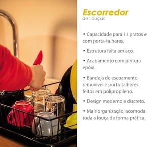 Conteúdo da Embalagem: 1 bandeja removível, 1 suporte para talheres, 1 escorredor em aço
