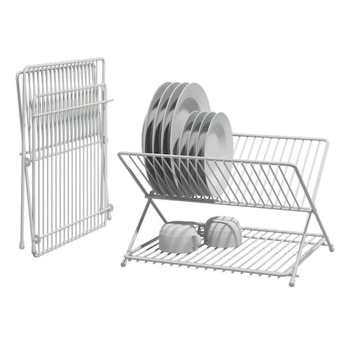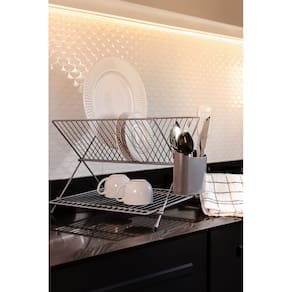 Com estrutura aramada resistente, o escorredor é durável e capaz de suportar uma variedade de utensílios de cozinha. Sua característica articulada permite que ele se adapte às suas necessidades, oferecendo a opção de ser fechado para economizar espaço ou aberto para acomodar uma maior quantidade de louças.