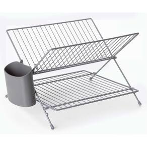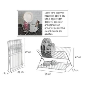 Dimensões do escorredor fechado: 39 x 35 x 3 cm Dimensões do escorredor aberto: 32 x 35 x 27 cm Capacidade: 19 pratos Material: Aramado, Plástico, Borracha Cor: Cinza Fabricante: Forma Utilidades Conteúdo da embalagem: - 01 escorredor de louças articulado; - 01 escorredor de talheres para acoplar.