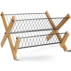 Elegância e Sustentabilidade: nosso Escorredor de Louça combina a beleza natural do bambu com a durabilidade do ferro, proporcionando uma solução de secagem de louça elegante e sustentável. Com um design em X dobrável, este escorredor de louça é extremamente prático. Ele pode ser facilmente dobrado para economizar espaço quando não estiver em uso. Com espaço suficiente para acomodar até 16 pratos, este escorredor é perfeito para famílias ou para quem gosta de cozinhar para amigos e convidados. O bambu e o ferro combinados oferecem resistência à umidade e durabilidade excepcionais, garantindo que seu escorredor dure por anos. A superfície lisa do bambu e a estrutura de ferro são fáceis de limpar, tornando a manutenção deste escorredor uma tarefa simples.