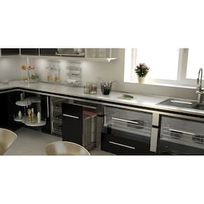 O Escorredor de Louças Aéreo da Schmitt possui capacidade para 45kg, 12 pratos, além de comportar copos e talheres, conta com bandeja removível e corrediças laterais para acesso deslizante.