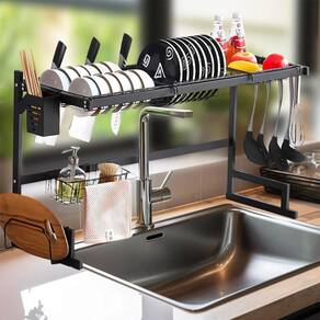 Economiza espaço: instala sobre a pia, liberando bancada. Multi compartimentos: pratos, copos, talheres, panelas, tábuas, detergente e utensílios ao alcance. Facilita a limpeza: água escorre direto para a pia. Durabilidade: aço carbono com pintura eletrostática preta, resistente à umidade e à corrosão. Ideal para cozinhas pequenas e apartamentos, mantendo tudo à mão.