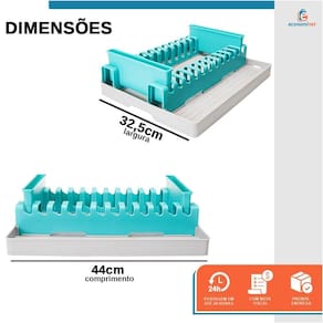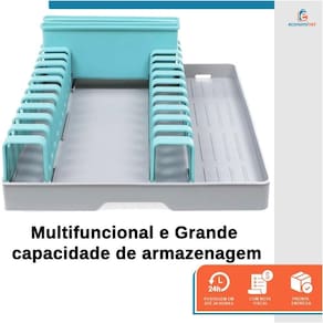Características: Tem capacidade para 12 pratos removendo recepiente de talheres e 5 copos. Inclui 2 recipientes de talheres removíveis para melhor acomodação. Escorrimento automático. Multifuncional e Grande capacidade de armazenagem. Leve e Dobrável. Entrada nas laterais para carregar facilmente para qualquer lugar. Este escorredor evita que seus pratos e copos fiquem em cima. Útil para manter a ordem em sua cozinha.