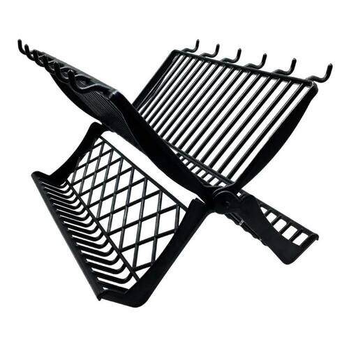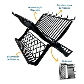 Escorredor de louça dobrável prato porta talheres copo xicaras - preto Escorredor de louça dobrável 15 pratos 12 ganchos xícaras + porta talheres - preto