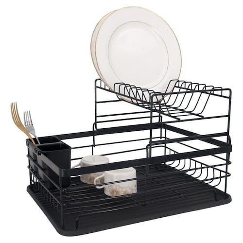 Características: Desenvolvido em aço com um refinado acabamento em pintura epóxi em pó, este escorredor é a síntese de qualidade e durabilidade. Seu design de dois andares oferece uma capacidade impressionante para até 9 pratos, garantindo praticidade no seu dia a dia. Além disso, conta com um compartimento removível para talheres e uma bandeja coletora que evita o acúmulo de água na pia, mantendo tudo organizado e limpo.