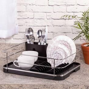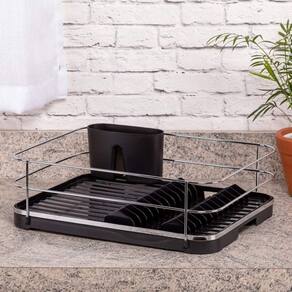 Com muita elegância e sofisticação, este escorredor possui bico fixo para vazão da água. Você direciona essa saída de água para dentro da cuba e a pia fica sempre seca. Tem capacidade para 12 pratos e um porta talheres removível, que pode ser posicionado onde for mais conveniente. É fabricado em plástico e aço carbono, com detalhe em aço piatina cromado (aço em formato achatado), o que traz maior resistência contra ferrugem.Características:- Dimensões: 40,5cm (Profundidade) x 35,5cm (Largura) x 13,5cm (Altura)- Peso: 1,020kg- Conteúdo da embalagem: 1 Escorredor de Louças e 1 Suporte para Talheres- Possui Tecnologia Rust Free: Resistente ao ferrugem, aos raios UV e à umidadeEspecificações:Matéria-prima: Plástico + Aço CarbonoCapacidade: 12 pratosLinha: OriginaleDicas de uso:- Para limpeza periódica recomenda-se o uso de um pano macio, água e sabão neutro.- Nunca utilize materiais abrasivos como esponjas ásperas ou produtos químicos corrosivos (cloro, água sanitária).