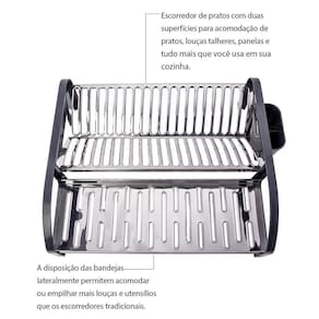 Escorredor de pratos com duas superfícies para acomodação de pratos, louças talheres, panelas e tudo mais que você usa em sua cozinha. Suas bandejas de acomodação ficam unidas lateralmente em bases de polipropileno pp na cor preta que deixam seu escorredor firme e com um design moderno. Acompanha porta talher em polipropileno pp que pode ser instalado nas duas laterais do escorredor. A disposição das bandejas lateralmente permitem acomodar ou empilhar mais louças e utensílios que os escorredores tradicionais. Bonito, prático e de fácil limpeza. Altura: 15cm; Largura: 44,8cm; Comprimento: 51cm; Peso aprox. 1,450kg. Ean: 7898681710867