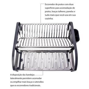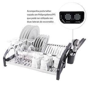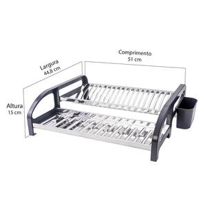 Escorredor de pratos com duas superfícies para acomodação de pratos, louças talheres, panelas e tudo mais que você usa em sua cozinha. Suas bandejas de acomodação ficam unidas lateralmente em bases de polipropileno pp na cor preta que deixam seu escorredor firme e com um design moderno. Acompanha porta talher em polipropileno pp que pode ser instalado nas duas laterais do escorredor. A disposição das bandejas lateralmente permitem acomodar ou empilhar mais louças e utensílios que os escorredores tradicionais. Bonito, prático e de fácil limpeza. Altura: 15cm; Largura: 44,8cm; Comprimento: 51cm; Peso aprox. 1,450kg. Ean: 7898681710867