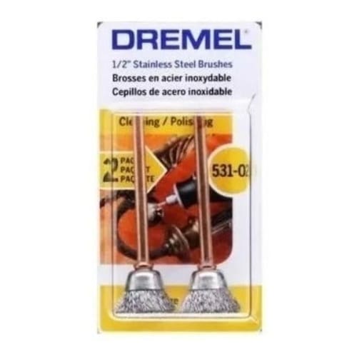 escova de aço inox 1/2 531 dremel escova de aço inox 1/2” 531 dremel escova com cerdas de aço inox desenvolvidas para trabalhos em superfícies de aço inoxidável, alumínio, prata, liga de estanho e outros metais resistentes a corrosão, pois não deixa resíduos que causam 'óxido posterior'. Ótima para limpeza, remoção de rebarbas e dar acabamento em locais de difícil acesso, como superfícies com fendas. A show d`casa não presta serviços de assistência técnica. Caso seu produto apresente defeito em seu funcionamento ou de fabricação, você deve encaminhá-lo para uma assistência técnica autorizada mais próxima de seu domicílio, ou com a central de atendimento do fabricante para informações de assistências técnicas ou procedimentos a serem feitos.